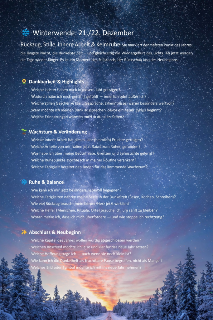 Als kleines Weihnachtspresent meinerseits möchte ich hier ein Dokument mit dir teilen, was ich vor nicht zu langer Zeit für mich selbst erstellt habe – und auch selbst heute reflektieren werde. Du kannst es für jede kommende Wintersonnenwende nutzen, um in der Schnelllebigkeit inne zu halten, und all das Schöne, was an dir vorbeigezogen ist, dir nochmal ganz bewusst und aufmerksam vor Augen zu führen.
